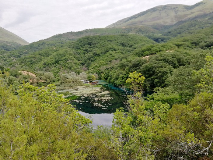 „A forrás tiszta, kék vize egy több mint ötven méter mély medencéből tör fel – a búvárok ötven méterig ereszkedtek le, de a karsztlyuk pontos mélysége még nem ismert. Innen ered a Bistrica folyó, amely 25 km hosszú és Sarandától délre torkollik a Ión-tengerbe.” (Wikipedia)
