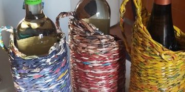 Színes papír üveg tartók, papírból fonva