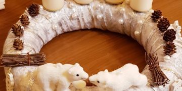 Hungarocell koszorúalap kávé színűre festve, a kávészemek egyesével felhelyezve és gyertyával angyalkával díszítve!