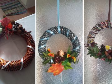 Mindenféle ajtó dísz, koszorú papírból, papírfonással