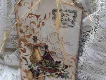 Vágódeszka díszítve decoupage és transzfer technikával valamint stencilezéssel.