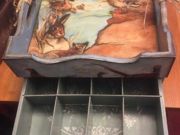 Fiókos nagy méretű tálca vegyes technikákkal: decoupage, festés