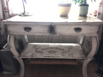 Régí asztal felújítása. A lapja decoupage technikával elkészítve, a többi része bútorfestékkel festve, antikova, stencilezve.